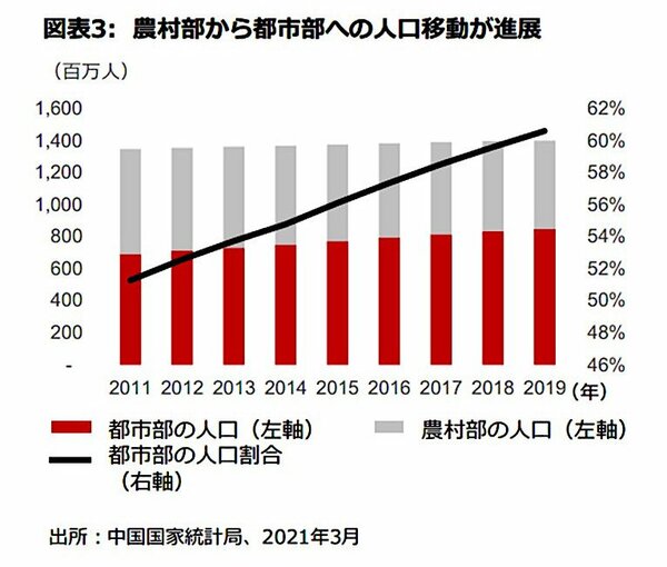 過去5年間では、1億人が農村部から都市部への居住権を与えられた。この政策を補完するために、政府は都市部の古い住宅地を改築し、新しい住民の流入に対応するために2,100万戸の新しい住宅を供給している。この政策の継続で、中国は2025年までに都市人口比率を65%にすることを目指しており、これにより中間層の拡大と経済成長率の上昇が期待されている。