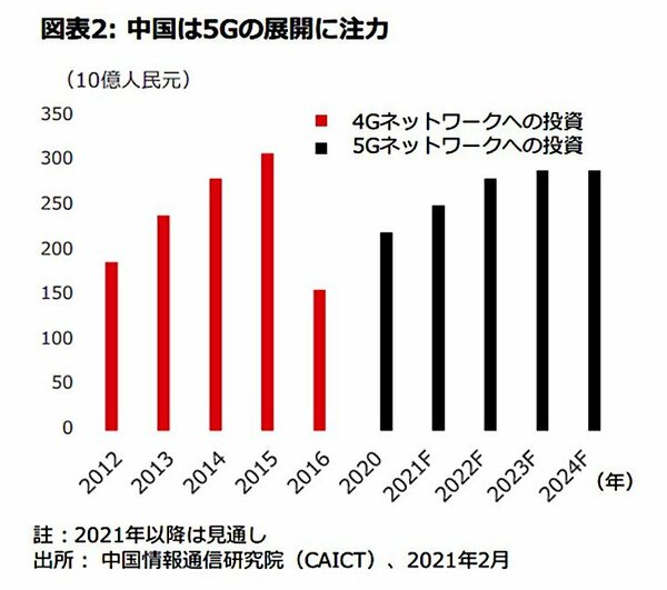 中国は、5G、人工知能、半導体、電気自動車など、21世紀の最先端技術に着目している。次世代のモバイル技術で世界の先頭に立つことを目指し、5Gの導入に多額の投資を行う構えである(図表2参照)。