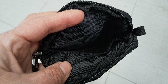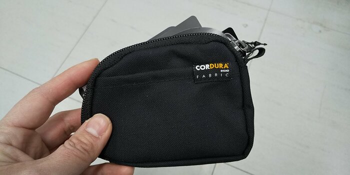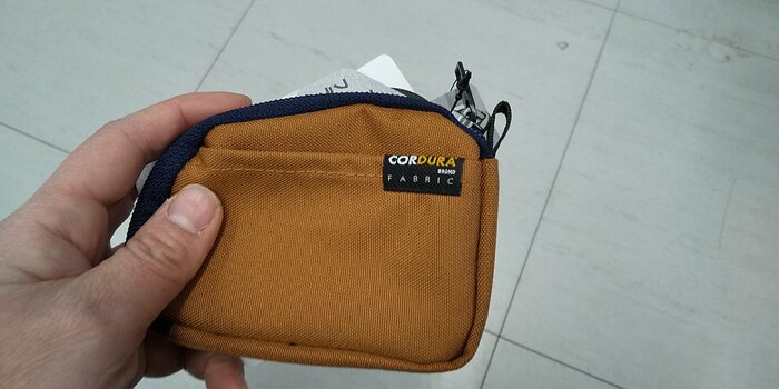 耐久性に優れたCORDURA®生地を使用したワークマンのコインケースで、お札も収納できるポケット付きです。外側にカードがぴったり収まるサイズのオープンポケットが1つ、中にもカードが入れられるポケットがひとつついています。紙幣は3つ折、4つ折にする必要があります。メインスペースに小銭、電子マネーのカードを外ポケットに、予備で紙幣を1枚内ポケットにぐらいが、ちょうどよさそうです。また撥水加工なので、雨の日に落としてしまっても安心です。