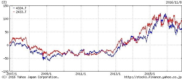 グラフの右側を見ると、赤い博報堂DYの株価が青の電通を上回っていることが見て取れます。電通の逆風は、博報堂DYには追い風になっているのかもしれません。