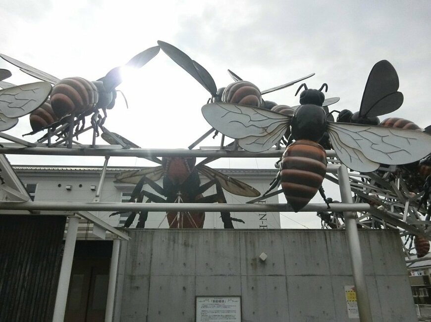 大きくてリアルな造りのハチたちが、トイレの屋根一面を覆っています。少し離れたところから見ても、ものすごいインパクトです。