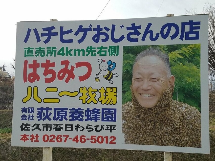 これは、長野県佐久市の国道254号線沿いにある看板です。ハチヒゲおじさんは荻原養蜂園でハチミツを生産販売しており、2020年11月8日の「世界の果てまでイッテQ!」でも紹介された有名人。これまで何度もテレビ出演をしているのだとか。