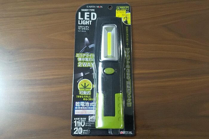 夜の車内は灯りが限られてしまうため、ちょっとした作業や探し物が不便だったりします。スマートフォンの灯りなどもありますが、長時間使うのは実用的ではありません。そんなときのために一つ持っておきたいのがこちらの「LEDハンディワークライト」です。