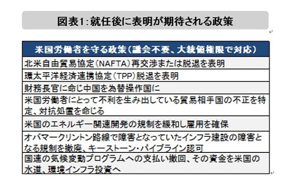 1点目は、就任直後に表明されると見られる政策です。米国大統領の権限は強力で、議会承認(立法化)がなくても様々な政策が可能と見られます(図表1参照)。公約通りなら、就任直後の政策は、このような大統領権限で進められる政策が表明されるものと見られます。その中心は、TPP脱退表明など通商関連の政策が主なものとなる見込みです。