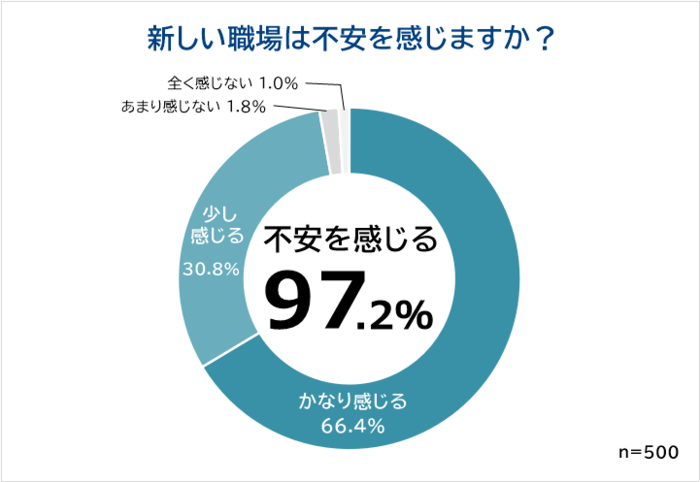 しかし、新しい職場に関してはそうとも言えないようです。今回の調査で「新しい職場は不安を感じますか?」という質問をしたところ、「かなり感じる(66.4%)」「少し感じる(30.8%)」という結果になり、97.2%の方が新しい職場に対して少なからず不安を抱いていることがわかりました。