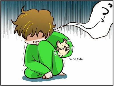 祭さんの家は、温度変化に弱いネズミさんたちが過ごしやすいよう、基本的に室温は一定(22℃前後:20話参照)に保たれているのですが、これは、人間の祭さんにとって、冬場は肌寒く感じる温度でもあります。このため、冬仕様の祭さんの部屋着は、おなじみのスウェットの上下にプラスして、厚手の上着と腹巻、足元はヒーターつきルームブーツと、少々重装備。