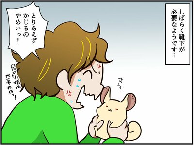 しばらくの間、部屋の中を走り回っていた福くんですが、しばらくすると祭さんの足元が気になって仕方がないとばかりにまとわりつきはじめました。それもそのはず。福くんが祭さんの家にやってきたのは今年の1月。彼にとっては、冬仕様のルームブーツ着用の祭さんが普段の姿であり、裸足になった姿は見たことがなかったからです。