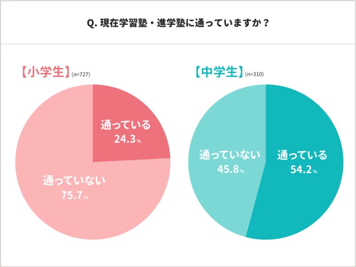 まず、「現在お子さんは学習塾・進学塾(自習型学習塾や通信教育・家庭教師などは除く)に通っていますか?」と質問したところ、小学生の場合は24.3%が、中学生の場合は54.2%が「学習塾・進学塾に通っている」と回答しました。