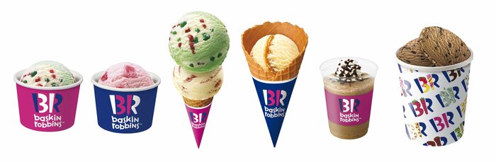 サーティワンのお店で「たくさんのフレーバーをもっと楽しんでもらいたい」「幸せな気持ちになってもらいたい」という気持ちを込めて、コーンのスリーブや、カップ、手提げ袋など、パッケージも一新!