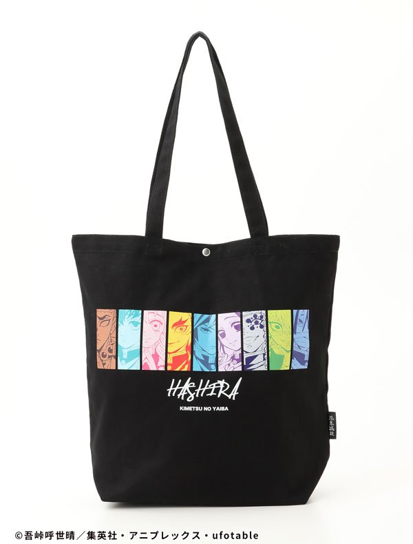 TVアニメ「鬼滅の刃」アイテムです。「柱」の鮮やかなキャラクタープリントが目を引くトートバッグとなっています。また、「惡鬼滅殺」の文字が入った、サイドのピスネームもポイントです。大きめのサイズなので、普段使いはもちろん荷物の多いレジャーなどにも活躍してくれそうです。