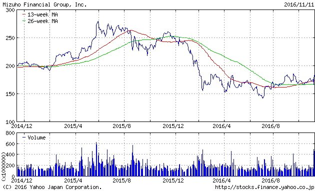 みずほFGは2016年11月14日、経営諮問機関を設立し、アリババグループのジャック・マー会長、日産自動車のカルロス・ゴーン社長らを起用するとも報じられています。フィンテックの台頭で伝統的銀行業にも新たなディスインターミディエーションのリスクが台頭してきました。矢継ぎ早の改革を示すことが株価本格反騰の必要条件になるでしょう。