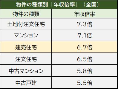 住宅金融支援機構が【フラット35】を利用した人のデータを基に集計した調査結果から、物件の種類による年収倍率を表に表しました。