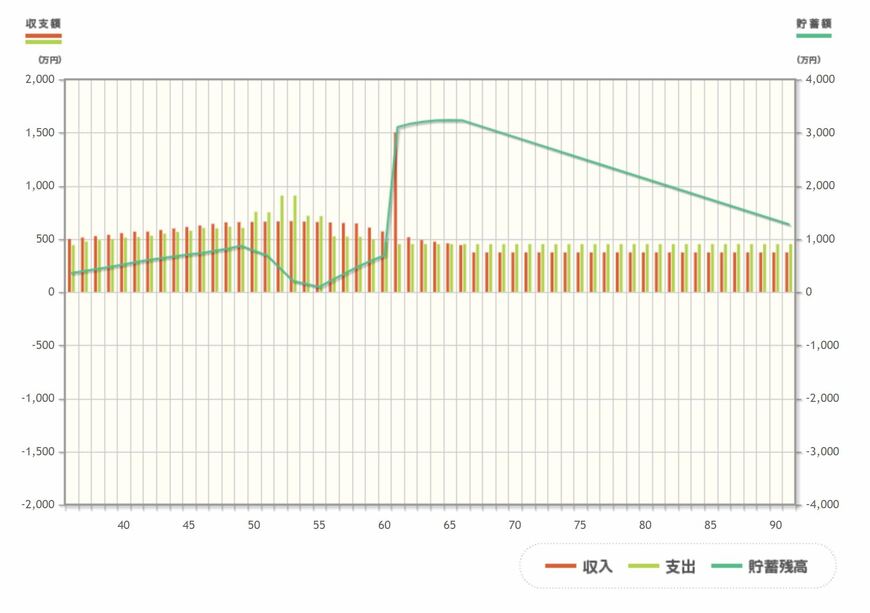 50歳から55歳にかけて、支出が大きく増え、貯蓄が減っていることがわかります。これは子ども2人の大学進学と重なっていることで、教育費の支出が影響しています。