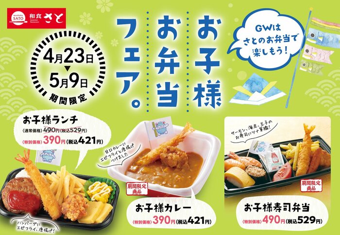 大人向けメニューは他にも「ミニお寿司セット(税込538円)」や「若鶏の唐揚げ弁当(税込430円)」なども登場。お子さんたちの大好きな「お子様ランチ(税込421円)」や「お子様カレー(税込421円)」と合わせて、家族みんなが大満足のお弁当を楽しめそうです。