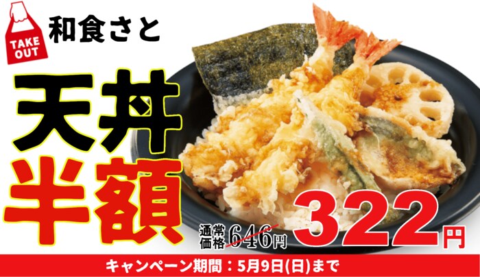 和食さとでは、おうちでじっくり楽しめるテイクアウトメニューを多数展開しています。今回、4月23日(金)から5月9日(日)までの期間限定でおこなわれている「お子様お弁当フェア」と一緒に開催され注目を集めているのが、テイクアウト天丼の半額サービスです。通常税込646円で販売されている天丼が今回はなんと税込322円での登場と大変お得です。