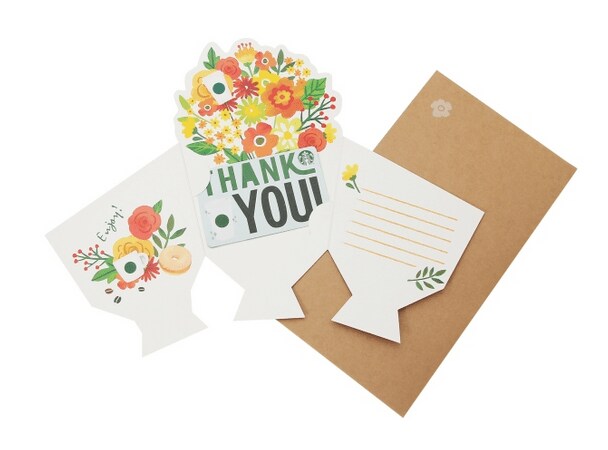 ⺟の⽇や感謝を伝えたい⼈に贈りたいカードギフトです。こちらはオンラインストア限定アイテムです。ブーケ型メッセージカードがセットになった、この時期おすすめのカードギフト。イエローとレッド2色の展開です。メッセージカードの一部にはスターバックスらしいモチーフのステッカーが5種類付いています。⺟の⽇のギフトをはじめ、日頃の感謝を伝えたい大切な人に、メッセージを添えて贈ってみるのもいいかも。
