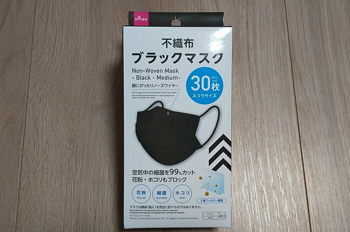 ファッションにも最適。ダイソー「不織布ブラックマスク」30枚入り