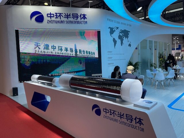 天津市の中環半導体はインゴットの引き上げからウエハー加工、ディスクリートやMEMSのチップ製造、さらに組立・検査までを一貫生産している。昨年は中国の家電大手で液晶パネルと有機ELパネルを内製しているTCLグループの資本傘下に入ることが決まった。今後はTCLの家電向けに電源管理ICなどの生産を増やしていくと予測される。中環半導体の展示ブースでは、200mmと300mm口径のシリコンインゴットを展示していた。天津工場で開発した製造技術を、立ち上げ中の宜興工場(浙江省、200mmと300mmライン)に移植し、年内に稼働させる。