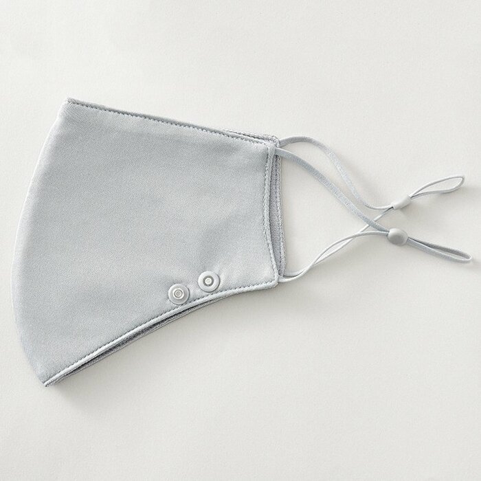 肌側に吸水速乾・接触冷感・吸放湿性に優れた素材「ファイバードライ」を使用したマスク。あご側にボタンがついており、スキマをつくって呼吸を楽にしたり、ボタンを留めてしっかりフィットさせたりと2WAYで使用できるのがポイント。洗って繰り返し使えます。