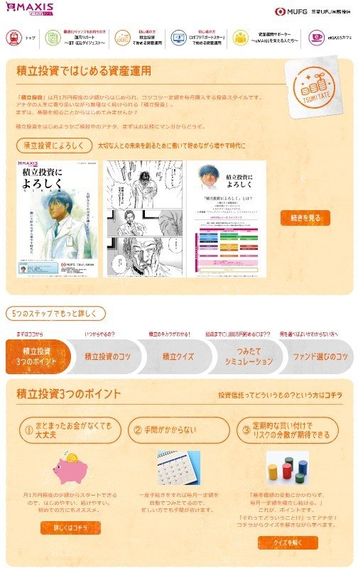 (へえ、ロボアドバイザー※ね…複数の簡単な質問に答えると自動的に顧客に合った資産配分の提示をやってくれるんだ。なるほどね。ロボアドバイザーが自動的に判断するなら、見た目で決めつけられたりしないし、僕自身が気づいていない志向もわかるんじゃないだろうか。でも、わかったところでどうしたら…。ん?これは?)