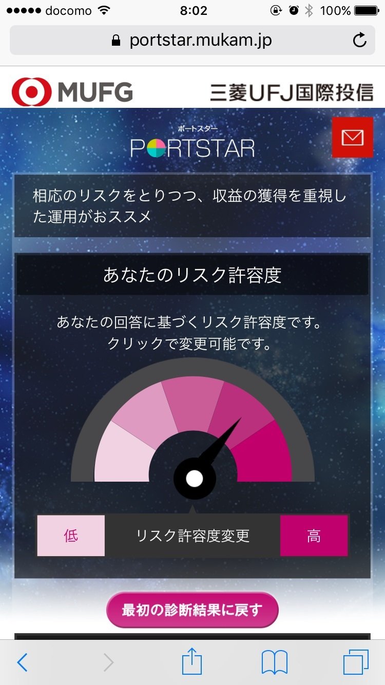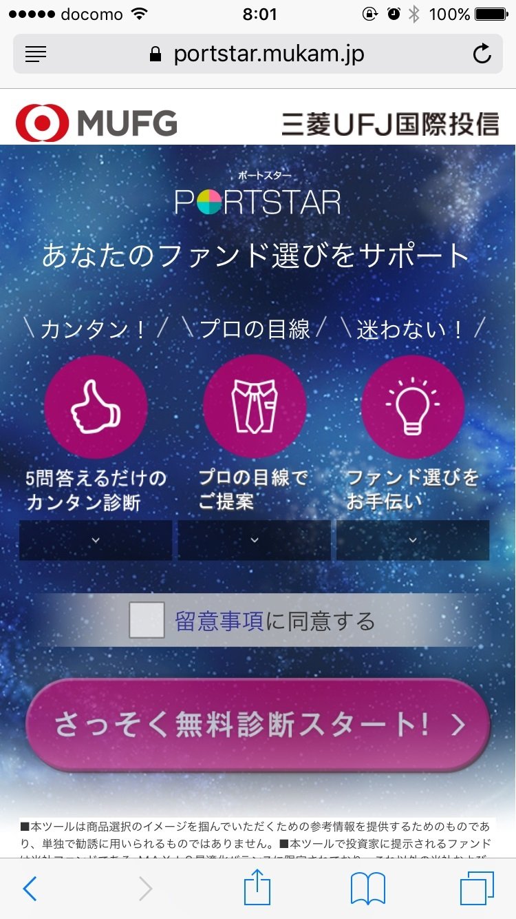 (「ポートスター」…?これもロボアドバイザーを使ったサービスみたいだな。なになに、5つの質問から「リスク許容度」を診断して資産配分をアドバイス?うーん、リスク許容度が何かイマイチわからないけど、5問なら簡単だな。無料診断でスマホからできるんだ。た、試してみるか…?)