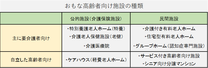 ここではざっくりと“老人ホーム”という呼び方をしていますが、高齢者向けの施設にはどのような種類があるのか見てみましょう。表「おもな高齢者向け施設の種類」をごらんください。