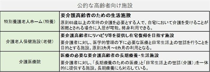 公的施設の場合は、介護保険が適用されるため、民間施設よりも比較的安価で利用できます。介護が必要となった時に利用できる施設で公的施設は以下の3つです。それぞれの特徴を見てみましょう。表「公的な高齢者向け施設」をごらんください。