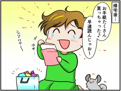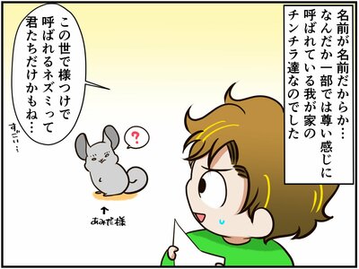 このお話に登場しているだけでも、チンチラの大明神さんと小明神さん、デグーのけまりちゃん&松くん夫婦とその子どもたち等々…。10年の間にメンバーは入れ替わり、現在祭さんは、おみくじちゃんとあみだちゃんというチンチラの母子、元保護チンチラの福くん、デグーの棟梁ちゃんというネズミさんたちと一緒に生活しています。