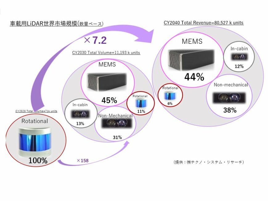 まず、車載用LiDAR市場規模の最新の見方はどうなっているのか。車載用センシングシステム市場調査で長年の蓄積を持つテクノ・システム・リサーチ(TSR)に確認してみたところ、車載用LiDAR市場規模(数量ベース)は20年の約7万台から30年には1119万台に拡大し、自動運転レベル4以上へ移行すると見られる40年には8053万台規模まで拡大すると見通していることがわかった。また、車載用LiDARのタイプも、20年は360°回転型のモーター駆動式Rotationalが大半を占めているが、30年にはMEMSタイプが5割弱、駆動部レスなNon-Mechanicalタイプが3割強となり、40年にはMEMSタイプが4割強、Non-Mechanicalタイプが4割弱へとシフトしていくとの見方を示している。