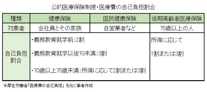 日本には公的医療保険制度があるため、医療費の自己負担は70歳未満は3割、70歳から75歳未満は所得に応じて2割または3割、75歳以上は所得に応じて1割または3割となります。「【表】公的医療保険制度・医療費の自己負担割合」をごらんください。