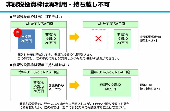 たとえば、つみたてNISAで20万円分の金融商品を買って同年内に売っても、その年の残りの非課税投資枠は20万円のまま。40万円には回復しません。