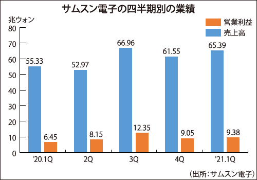 サムスン電子は、半導体事業で21年1~3月期に売上高19兆100億ウォン(約1.8兆円)、営業利益3兆3700億ウォン(約3272億円)を計上した。売上高は前年同期比7.8%増加したが、営業利益は同15.5%減少した。「NANDフラッシュの価格下落と増設ライン向けの初期費用が営業利益の減少に影響した」と説明する。また、21年2月に米テキサス州の寒波に伴いオースティンのファンドリー工場が停電となり、連結業績に大きな打撃を与えた。同社は半導体で1日平均250億円強を売り上げている。