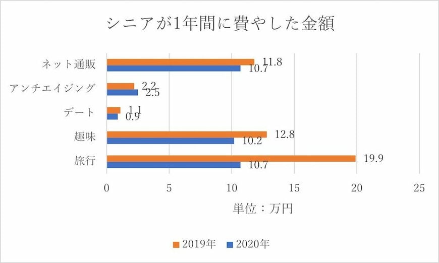 本調査ではシニアに、1年間(2019年、2020年)に、旅行や趣味、デート、アンチエイジング、ネット通販にいくらくらいお金を費やしたかを聞いています。その結果は図表4のようになりました。