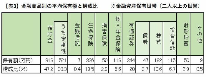 【表3】「金融商品別の平均保有額と構成比」および、グラフをごらんください。