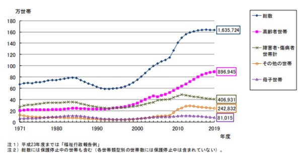 2019年度の被保護世帯数(1カ月平均)は163万5724世帯で、前年度から1698世帯の減少でした。
