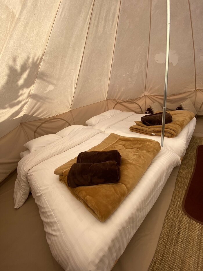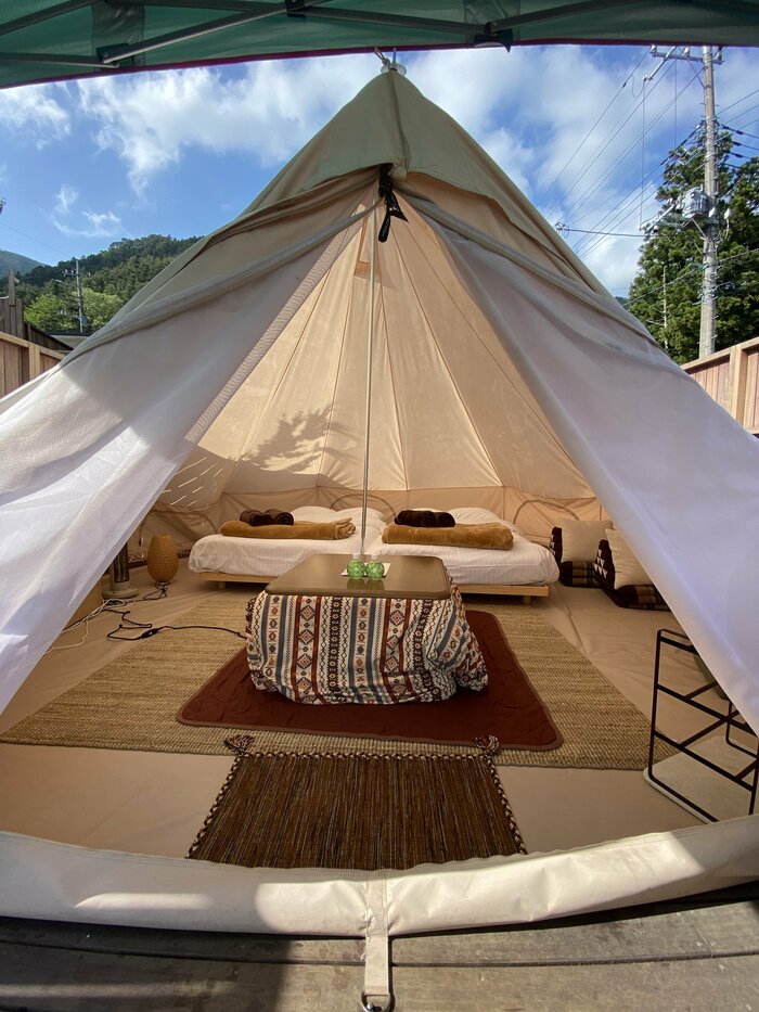 セミダブルベッド2台と、BBQグリル付のウッドデッキが設置されたテントは、最大4名様まで宿泊できる。テント内にはシャワーとトイレがないので、共用のシャワーとトイレを利用する。女性好みのインテリアで、コタツや照明の灯りなど、ロマンティックな雰囲気になるので、女子会や恋人同士なら断然こちらがおすすめだ。