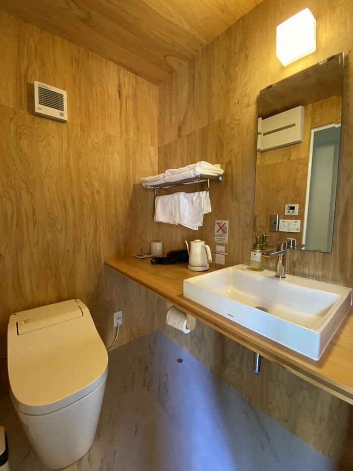 キャンプ施設では珍しい、専用の洗面台とトイレ、隣にはシャワーも完備。