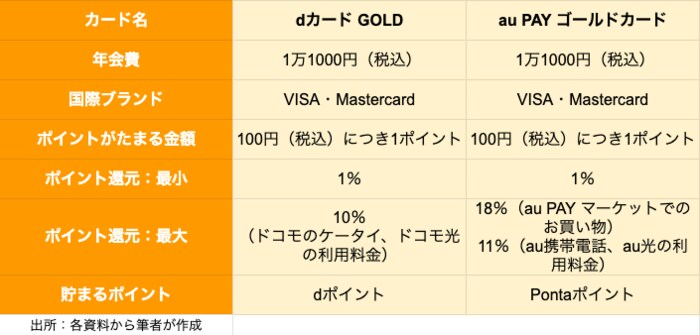 「dカード GOLD」と「au PAY ゴールドカード」を比較
