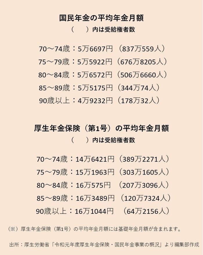 さいしょに、厚生労働省の「令和元年度 厚生年金保険・国民年金事業の概況(2019年度)」から、70代以上のみなさんの国民年金・厚生年金受給額の平均を見ていきましょう。