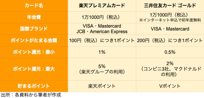 「楽天プレミアムカード」と「三井住友カード ゴールド」を比較