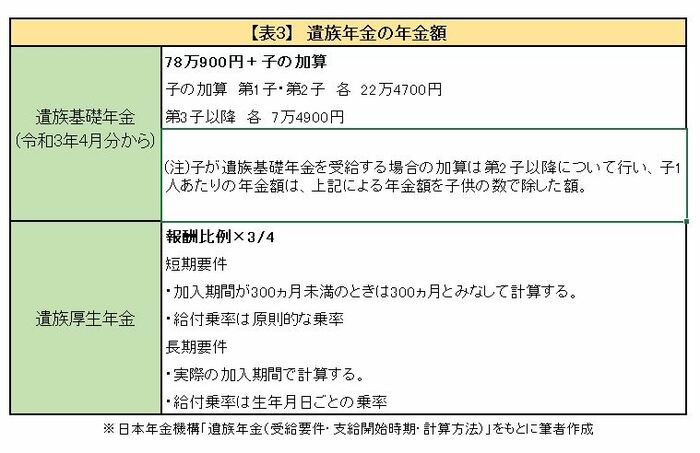 次は、【表3】より、遺族年金の年金額がどのくらいかを見ていきます。