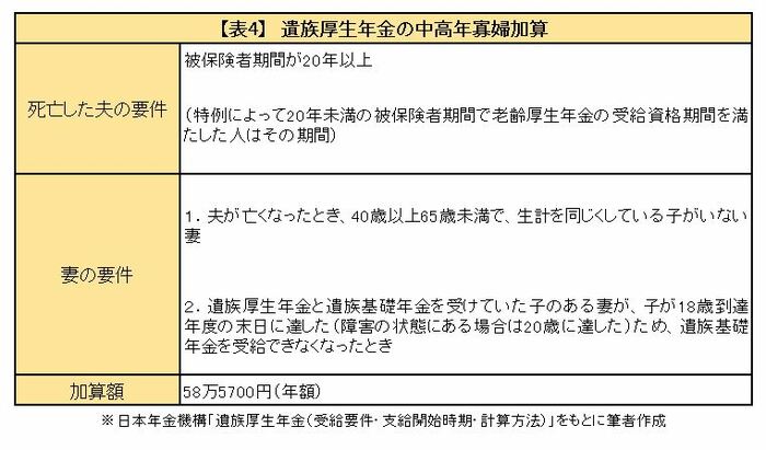 遺族厚生年金には中高齢寡婦加算という加算給付があります。【表4】の条件に当てはまる場合に、遺族の妻が40歳から65歳になるまでの期間、中高齢寡婦加算が遺族厚生年金に加算されます。