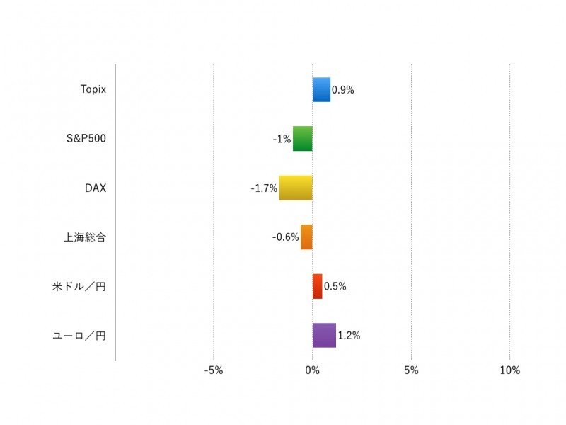 先週(11月28日‐12月2日)の世界の株式市場はまちまちでしたが、主要国の株式市場は日本を除き軟調でした。週間騰落率は現地通貨ベースでTOPIXが+0.9%、米S&P500が▲1%、独DAXが▲1.7%、上海総合が▲0.6%でした。