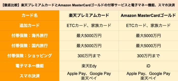 【徹底比較】楽天プレミアムカードとAmazon MasterCardゴールドの付帯サービスと電子マネー機能、スマホ決済