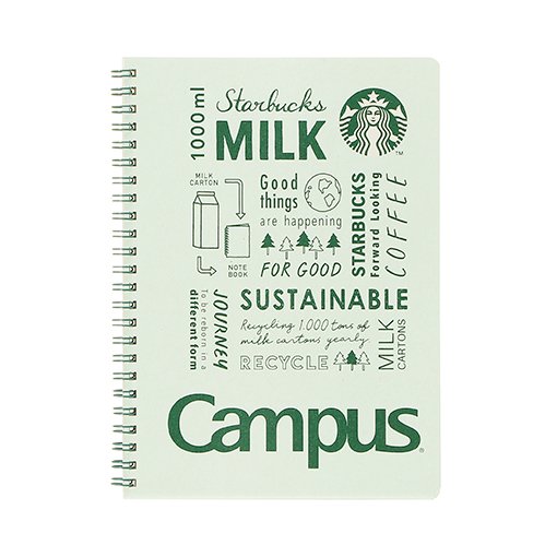 スターバックスのお店から集めた「ミルクパック」を使用して作ったかわいいキャンパスノートです。表紙と裏表紙には「ミルクパック」を主原材料とした再生紙を使用しています。
