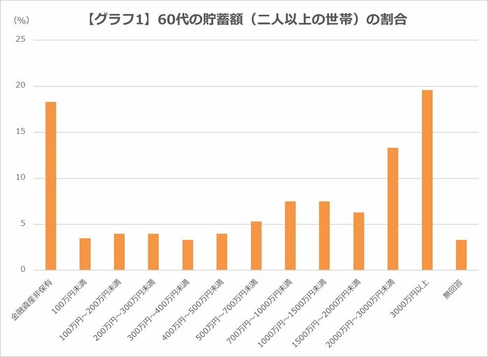 60代の単身世帯では、割合が一番多いのが「金融資産非保有」世帯の29.4%、次に多いのが3000万円以上の世帯の13.8%となっており、こちらも両極端の結果でした。