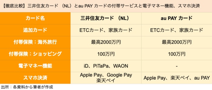【徹底比較】三井住友カード (NL)とau PAY カードの付帯サービスと電子マネー機能、スマホ決済