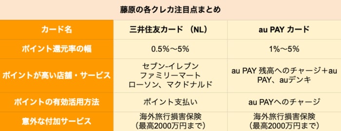 いかがでしたでしょうか。今回は三井住友カード (NL)とau PAY カードを比較しました。両クレカポイントを貯めるには三井住友カード (NL)の場合、セブン‐イレブン、ファミリーマート、ローソン、マクドナルドの利用頻度が高い人が、au PAY カードの場合au PAYの利用とauでんきへ加入している人がポイントを貯めやすいと言えます。少しでもクレジットカード選びの参考になれば幸いです。