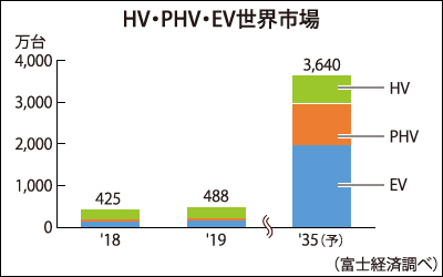 国内調査会社によると、HV、PHV、EVを合計した19年の世界市場は、EVやHVの好調から前年比14.8%増の488万台。20年は新型コロナの影響により同7.2%減の453万台のマイナス成長を余儀なくされた。しかし、自動車メーカー各社において環境対応車のラインアップの拡充が活発化しており、21年の市場は大きく拡大する見通し。以降、市場は堅調に拡大し、35年の電動車市場は19年比7.5倍の3641万台に達すると予測している。