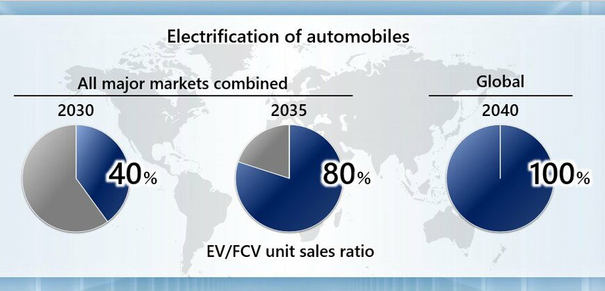 ホンダは、四輪車の電動化戦略として先進国全体でのEV・FCVの販売比率を30年に40%、35年には80%、さらに40年にはグローバルで100%まで高めていくことを目指す。「これは非常にチャレンジングな目標で、バリューチェーン全体での対応が不可欠。全員で目指す姿勢を共有し、実現に向けて高い目標を掲げることにした」と三部社長は語る。